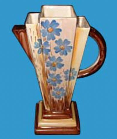 Description: Scattering of blue flowers to main body finger. Yellow fingers with brown handle and 'spout'. Brown and yellow layers to base..