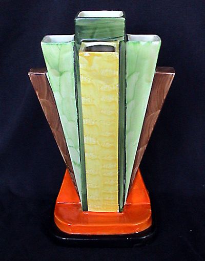 Description: Central finger: green, Front finger: yellow, Fingers to side of centre: pale green, Outer fingers: brown. Black base with orange top. Orange struts.