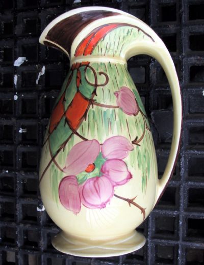 Description: Pink flowers on geometric stems in chequered pattern coloured orange and green. Brown spout and handle.